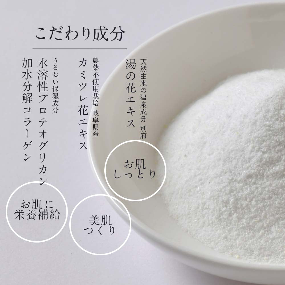セスキ炭酸Na、炭酸水素Na、酒石酸、酸化チタン、別府温泉精製湯の花エキス、カミツレ花エキス、水溶性プロテオグリカン、加水分解コラーゲン、グルタミン酸Na、ポリアクリル酸Na、ポリアクリル酸、ベントナイト、ステアリン酸PEG-75、エチドロン酸4Na、ケイ酸Ca、BG、水、香料